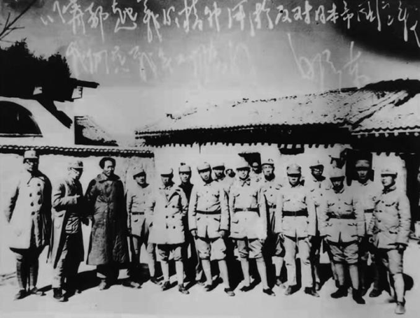 1938年,毛澤東(左三)、肖勁光(左一)和王稼祥(左二)與參加寧都起義的部分同志在延安合影并題詞(圖片來源:中國軍網(wǎng)-解放軍報)