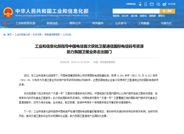 ◎我國電信企業(yè)首次獲得用于衛(wèi)星通信業(yè)務(wù)的國際電信碼號資源。3月5日,中國電信集團有限公司已獲得國際電信聯(lián)盟批準,取得E.164碼號(882)52及E.212碼號(901)09,分別作為天通衛(wèi)星業(yè)務(wù)的用戶撥號碼號和網(wǎng)絡(luò)識別碼號,這是我國電信企業(yè)首次獲得用于衛(wèi)星通信業(yè)務(wù)的國際電信碼號資源。