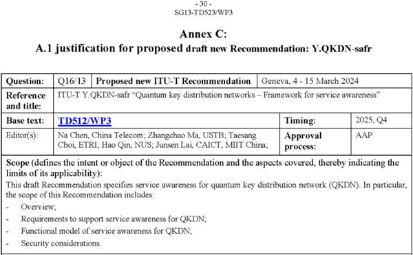 ◎我國量子通信國際標準立項取得新突破。3月4日至15日,國際電信聯(lián)盟電信標準部門第13研究組(ITU-T SG13)全體會議在日內(nèi)瓦召開。由中國電信研究院牽頭的國際標準立項提案ITU-T Y.QKDN-safr“Quantum key distribution networks–Framework for service awareness”(量子密鑰分發(fā)網(wǎng)絡(luò)——服務(wù)感知框架)獲批新立項。中國電信研究院與中國信通院等單位聯(lián)合牽頭的國際標準立項提案獲批新立項。這是繼中國電信代表央企首次推動量子通信國際標準化后又一重大突破。