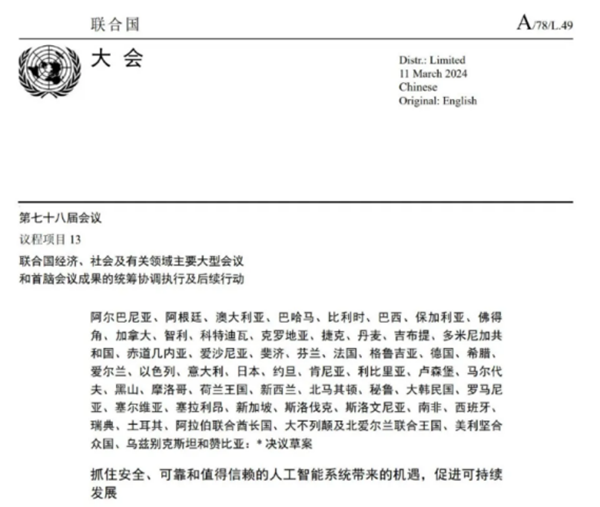 ◎聯(lián)合國通過關(guān)于人工智能的首個決議。3月21日,聯(lián)合國大會通過首個關(guān)于人工智能的全球決議《抓住安全、可靠和值得信賴的人工智能系統(tǒng)帶來的機遇,促進可持續(xù)發(fā)展》。這是聯(lián)合國大會首次就監(jiān)管人工智能這一新興領(lǐng)域通過決議。決議草案由美國提交,同時還有120多個會員國成為“共同提案國”或表達支持。