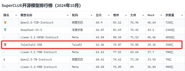 TeleChat2-35B以更小參數(shù)量和更佳效果獲得開源模型排行榜銅牌,綜合效果超過Llama-3.1-70B-Instruc和 Llama-3.2-90B-Instruct等較大參數(shù)模型。