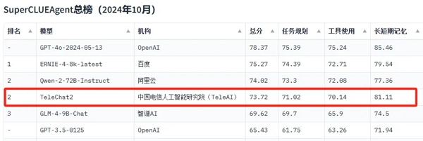 不僅如此,TeleChat2系列模型還完成了Agent能力建設(shè),重點加強了模型在指令跟隨、任務(wù)拆解、工具調(diào)用等方面的能力和表現(xiàn)。在10月的SuperCLUEAgent總榜中,TeleChat2排名并列第二。
