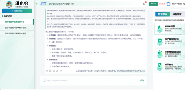 “雄小農(nóng)”AI農(nóng)業(yè)大模型基于AIoT技術(shù),融合DeepSeek-R1大模型增強(qiáng)推理、決策能力,通過數(shù)據(jù)驅(qū)動(dòng),形成“智能決策-數(shù)字生產(chǎn)-市場(chǎng)預(yù)判”閉環(huán),構(gòu)建了涵蓋農(nóng)業(yè)生產(chǎn)、流通及管理的智能化服務(wù)體系。大模型集成了農(nóng)技知識(shí)圖譜、多模態(tài)病蟲害識(shí)別引擎、農(nóng)產(chǎn)品價(jià)格預(yù)測(cè)模型及政策智庫平臺(tái)四大核心技術(shù),作為國內(nèi)首個(gè)基于DeepSeek的農(nóng)業(yè)行業(yè)大模型,實(shí)現(xiàn)技術(shù)與場(chǎng)景深度融合,服務(wù)與需求精準(zhǔn)匹配,支撐和運(yùn)維穩(wěn)定高效。在農(nóng)業(yè)生產(chǎn)層面,整合專家經(jīng)驗(yàn)、歷史數(shù)據(jù)等資源,形成標(biāo)準(zhǔn)化的農(nóng)技知識(shí)庫,提供科學(xué)化的種植、病蟲害防治等指導(dǎo)。在產(chǎn)品銷售層面,基于大數(shù)據(jù)分析和機(jī)器學(xué)習(xí)算法,預(yù)測(cè)農(nóng)產(chǎn)品市場(chǎng)價(jià)格走勢(shì),輔助品種選擇、茬口安排、品牌打造。
