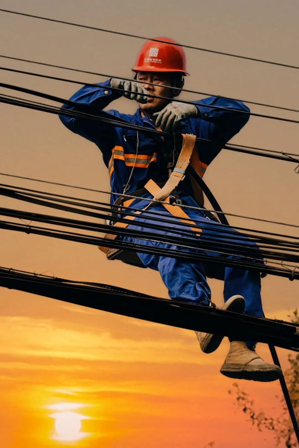 浙江通服嘉興公司線路技術(shù)員在一片落日余暉中,進(jìn)行架空線纜布放作業(yè)。他們是城市的“織網(wǎng)”者,編織網(wǎng)絡(luò),守護(hù)網(wǎng)絡(luò)通暢。