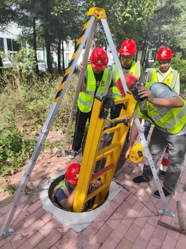 一個(gè)好漢,四個(gè)幫,你永遠(yuǎn)不知道通服人會(huì)從哪里出現(xiàn)。中國(guó)通建的維護(hù)人員既能上天,也能入地,在有限空間內(nèi)下井作業(yè),檢查線路。