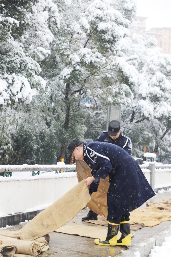湖南通服中信物業(yè)員工冒著風(fēng)雪,在泥濘濕滑的道路上鋪設(shè)毛毯,確保來(lái)往行人車輛安全通行。
