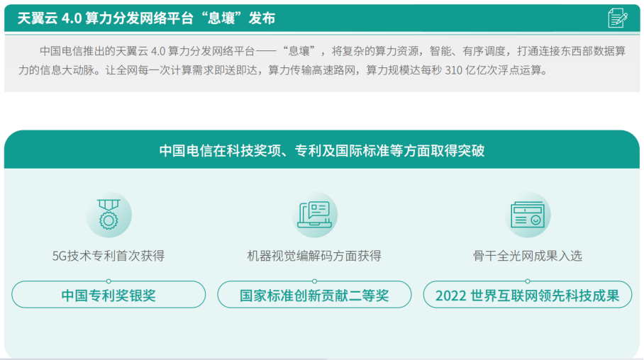中國電信強(qiáng)化科技創(chuàng)新對企業(yè)的戰(zhàn)略支撐作用,業(yè)內(nèi)影響力不斷提升。作為首批策源地單位,加快云計(jì)算原創(chuàng)技術(shù)策源地建設(shè),天翼云突破云操作系統(tǒng)、彈性計(jì)算、云存儲、分布式數(shù)據(jù)庫、CDN等關(guān)鍵核心技術(shù),TeleCloud OS4.0打破開源限制,天翼云4.0算力分發(fā)網(wǎng)絡(luò)平臺“息壤”入選“2022年度央企十大超級工程”。承建和開通全球規(guī)模最大的量子城域網(wǎng)“合肥量子城域網(wǎng)”。形成自研清單成果84個,員工小微成果1500余個,智能視頻云、天翼看家、CDN等收入達(dá)到十億元級,天翼云桌面、云堤等7項(xiàng)收入達(dá)到五億元級,網(wǎng)站安全專家、天翼安全大腦等6項(xiàng)收入達(dá)到億元級。面向共建共享網(wǎng)絡(luò)的智慧運(yùn)營系統(tǒng)等7項(xiàng)成果成功入選國務(wù)院國資委《中央企業(yè)科技創(chuàng)新成果推薦目錄(2022版)》。