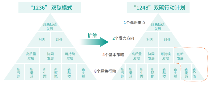 中國電信緊緊圍繞國家“雙碳”目標(biāo)和公司戰(zhàn)略,大力推進(jìn)“要素升級、集成創(chuàng)新”,突出創(chuàng)新發(fā)展,將“1236”雙碳模式進(jìn)一步擴(kuò)展升級為“1248”雙碳行動計(jì)劃,確定8大綠色行動及相關(guān)重點(diǎn)舉措,全面推進(jìn)企業(yè)綠色低碳轉(zhuǎn)型。