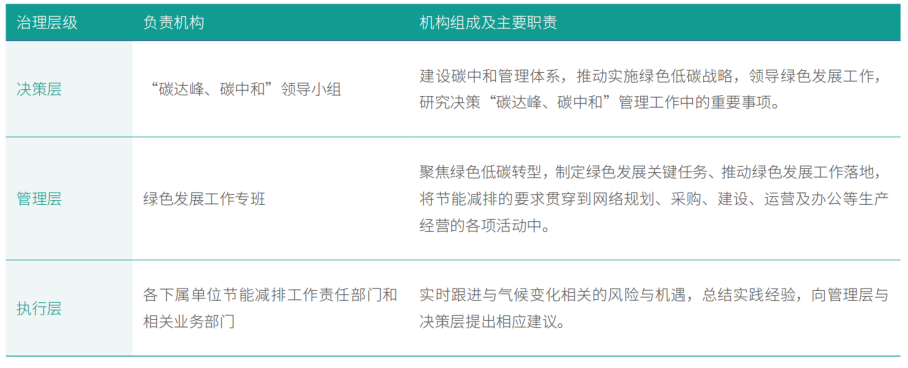 中國電信制定《中國電信碳達(dá)峰行動方案》和《中國電信2022年“碳達(dá)峰、碳中和”工作要求和考核辦法》,明確應(yīng)對氣候變化工作的管理架構(gòu)和各部門職責(zé),提出中國電信應(yīng)對氣候變化、實(shí)現(xiàn)碳達(dá)峰碳中和的目標(biāo)、行動計(jì)劃及具體舉措。