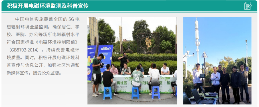 中國電信針對政府和公眾關(guān)心的通信工程建設(shè)中耕地保護(hù)、設(shè)備污染、施工影響和電磁輻射等問題,制定《中國電信通信基站電磁環(huán)境保護(hù)管理辦法(試行稿)》,建立健全電磁輻射管理體系與風(fēng)險防范機(jī)制,積極實(shí)施環(huán)境測評等各項(xiàng)環(huán)保措施,夯實(shí)環(huán)境保護(hù)基礎(chǔ),確保達(dá)到政府監(jiān)管要求,并積極與公眾做好溝通。