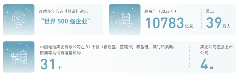 中國(guó)電信集團(tuán)有限公司是中國(guó)特大型通信運(yùn)營(yíng)企業(yè),連續(xù)多年入選《財(cái)富》雜志“世界 500 強(qiáng)企業(yè)”,主要經(jīng)營(yíng)移動(dòng)通信、互聯(lián)網(wǎng)接入及應(yīng)用、固定電話(huà)、衛(wèi)星通信、ICT 集成等綜合信息服務(wù)。集團(tuán)公司總資產(chǎn) 10,783 億元,員工 39 萬(wàn)人。
