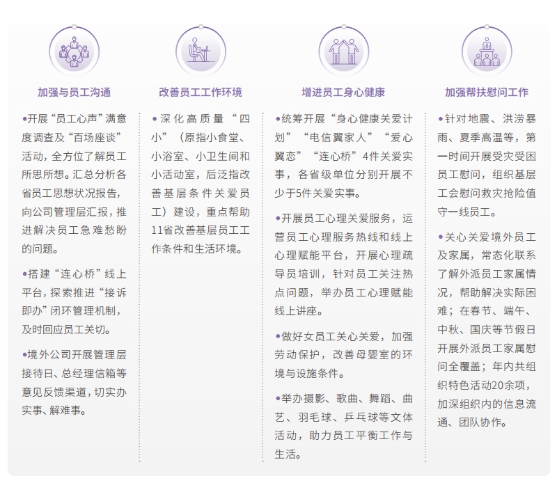 中國電信持續(xù)加強與員工溝通,了解員工訴求,加大對員工關(guān)懷,積極解決急難愁盼問題,提升廣大員工獲得感、幸福感、安全感,營造和諧向上的良好氛圍。