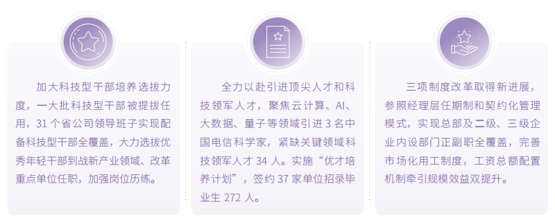 中國電信堅持人才是第一資源,發(fā)布人才強企工程實施方案,確立人才規(guī)劃目標,繪制人才圖譜,全方位培養(yǎng)、引進、用好人才。