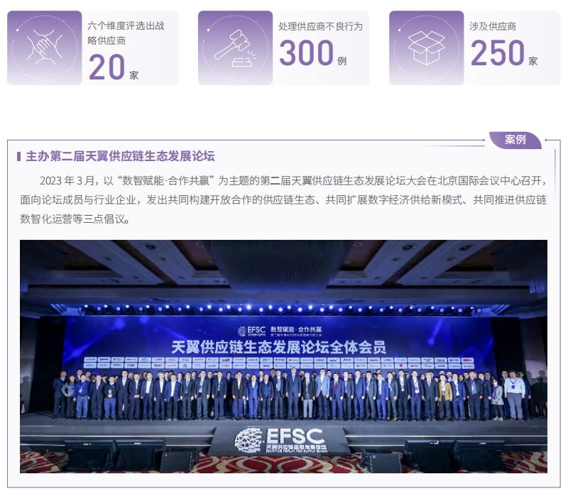 中國電信面向全部供應(yīng)商,強化供應(yīng)商分級分類管理,推進正向激勵和負面懲戒相結(jié)合的供應(yīng)商生態(tài)建設(shè),積極攜手供應(yīng)商共同打造負責(zé)任供應(yīng)鏈。