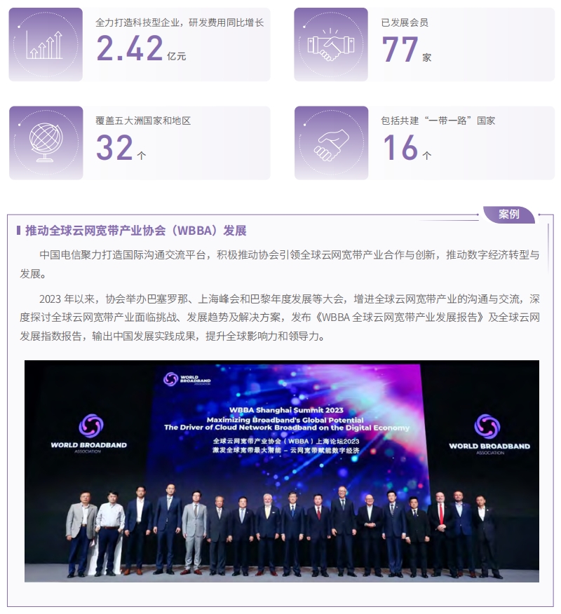 加快推動全球云網(wǎng)寬帶產(chǎn)業(yè)協(xié)會(World Broadband Association ,WBBA)建設(shè),積極吸納全球產(chǎn)業(yè)合作伙伴、知名企業(yè)和機構(gòu)加入 WBBA,提升會員規(guī)模和質(zhì)量,已發(fā)展會員 77 家,覆蓋五大洲 32 個國家和地區(qū);其中包括 16個共建“一帶一路”國家,并與全球移動通信系統(tǒng)協(xié)會(GSMA)簽訂戰(zhàn)略合作框架協(xié)議,高質(zhì)量合作生態(tài)圈初步形成,全球影響力顯著提升。