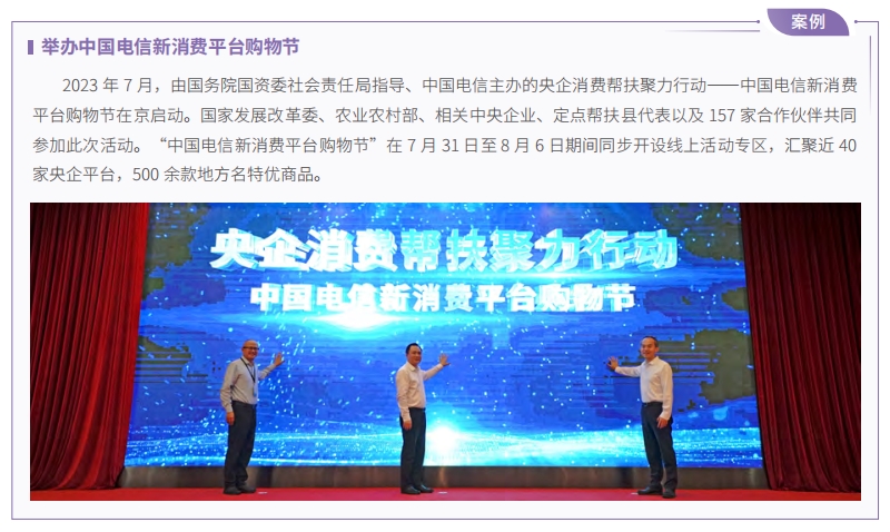 中國電信始終將消費幫扶作為促進脫貧地區(qū)特色產(chǎn)業(yè)提質(zhì)增效和持續(xù)發(fā)展的重要途徑,積極參與國務(wù)院國資委“央企消費幫扶聚力行動”“央企消費幫扶興農(nóng)周”,直接購買農(nóng)副產(chǎn)品 1.85 億元,幫助銷售農(nóng)產(chǎn)品 2.96 億元。