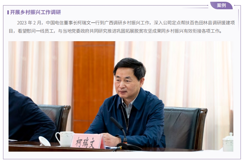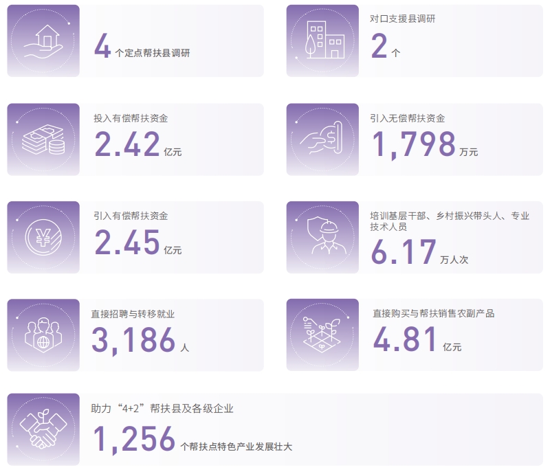 中國電信開展 4 個定點幫扶縣和 2 個對口支援縣(以下稱“4+2”幫扶縣)調(diào)研,投入有償幫扶資金 2.42 億元;引入無償幫扶資金 1,798 萬元;引入有償幫扶資金 2.45 億元;培訓(xùn)基層干部、鄉(xiāng)村振興帶頭人、專業(yè)技術(shù)人員 6.17萬人次;直接招聘與轉(zhuǎn)移就業(yè) 3,186 人;直接購買與幫扶銷售農(nóng)副產(chǎn)品 4.81 億元,助力“4+2”幫扶縣及各級企業(yè) 1,256個幫扶點特色產(chǎn)業(yè)發(fā)展壯大。