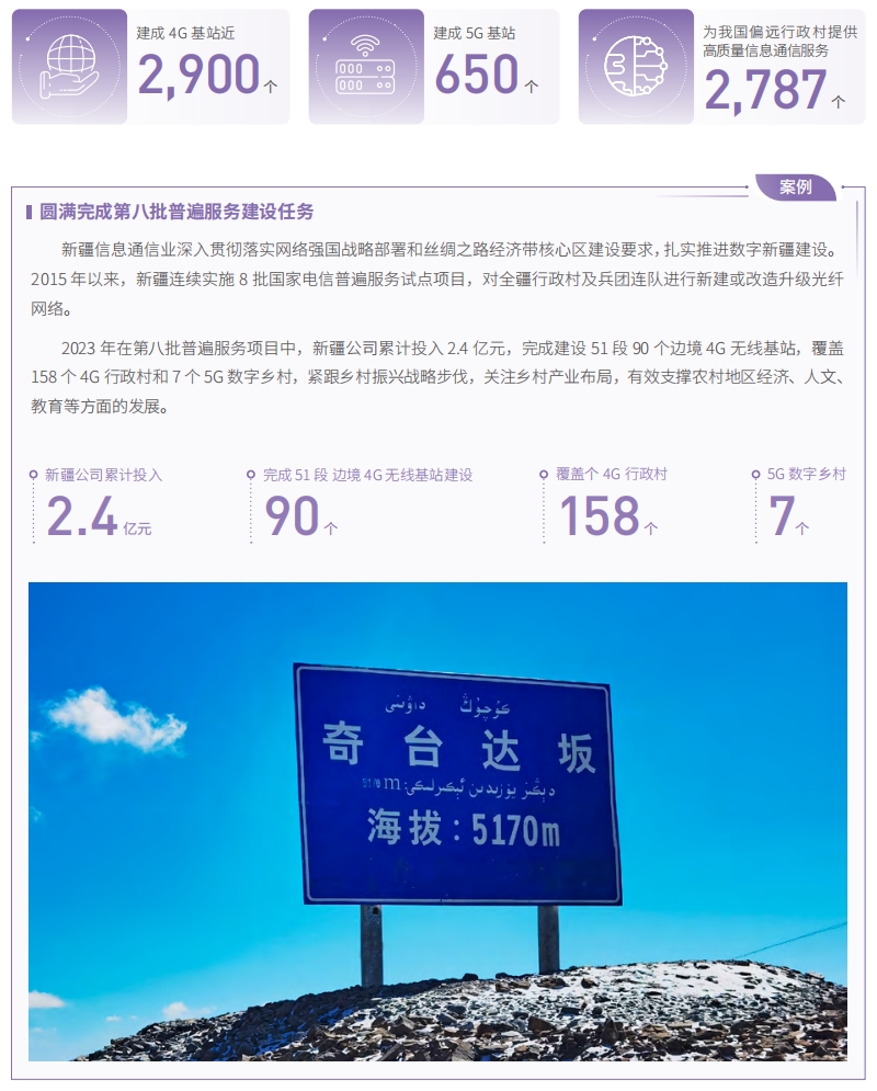中國電信連續(xù) 8 年承擔(dān)電信普遍服務(wù)任務(wù),從鋪光纜到建基站,不斷提高邊疆偏遠地區(qū)網(wǎng)絡(luò)覆蓋,彌合區(qū)域間“數(shù)字鴻溝”。2023 年,中國電信繼續(xù)深入實施第八批普遍服務(wù),建成近 2,900 個 4G 基站,650 個 5G 基站,為我國 2,787個偏遠行政村提供高質(zhì)量信息通信服務(wù)。