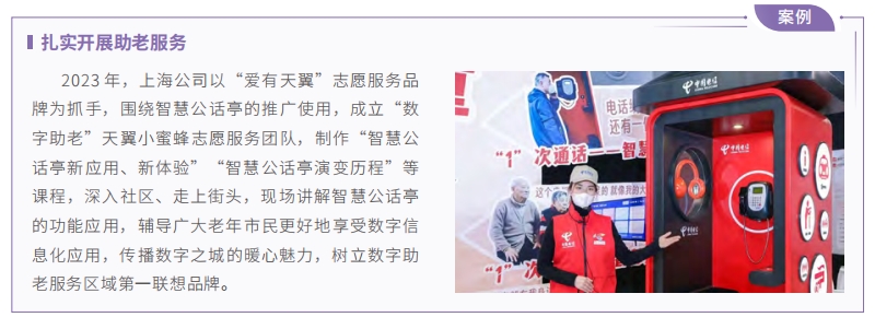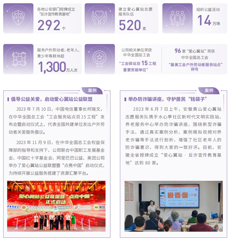 中國電信不斷深化“愛心翼站”公益服務(wù),發(fā)揮小切口大平臺作用,以有溫度的服務(wù)關(guān)懷社會特殊群體。建設(shè)擴充服務(wù)站點,融入屬地社區(qū)開展戶外勞動者關(guān)愛、智慧助老、青少年信息科普等全年齡段公益服務(wù),打造“戶外勞動者的港灣、跨越數(shù)字鴻溝的紐帶、科普信息技術(shù)的講臺和防范網(wǎng)絡(luò)詐騙的陣地”。開展愛心翼站全國點亮,實現(xiàn)近十萬家城鄉(xiāng)營業(yè)廳普遍加載“飲水休息、手機充電、廁所指引、手機輔導(dǎo)、防騙提醒、安防輔導(dǎo)”六項公益服務(wù),各地公安部門授牌成立“反詐宣傳教育基地”292 個,建立愛心翼站志愿服務(wù)隊伍 520 支,組織“清爽夏日愛騎月”“高考加油站”“暖冬計劃”等公益活動 14 萬場,服務(wù)戶外勞動者、老年人、青少年等群體超 1,300 萬人次。公司相關(guān)單位榮獲中華全國總工會“工會驛站雙 15 工程重要貢獻單位”,96 家“愛心翼站”榮獲中華全國總工會“最美工會戶外勞動者服務(wù)站點”稱號,獲評數(shù)量在全國共建單位中排名領(lǐng)先,廣西河池金城江街道新建社區(qū)(愛心翼站)榮獲中國科協(xié)“最美科技志愿服務(wù)點”。