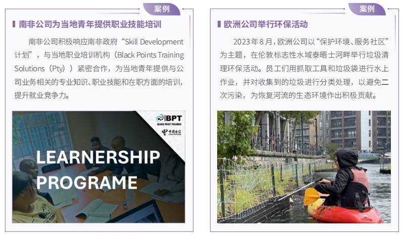 中國電信長期關(guān)注當(dāng)?shù)厣鐓^(qū)建設(shè),積極貢獻自身力量,融入當(dāng)?shù)厣鐣?、促進文化融合。持續(xù)開展海外公益活動,踐行聯(lián)合國可持續(xù)發(fā)展目標(SDGs)中“消除貧困”“數(shù)字化社區(qū)”“綠色環(huán)?!钡瘸h,構(gòu)建可持續(xù)治理框架,促進政府、企業(yè)和社會通力合作,助力當(dāng)?shù)卮蛟旄呋盍?、包容和繁榮的社會環(huán)境。
