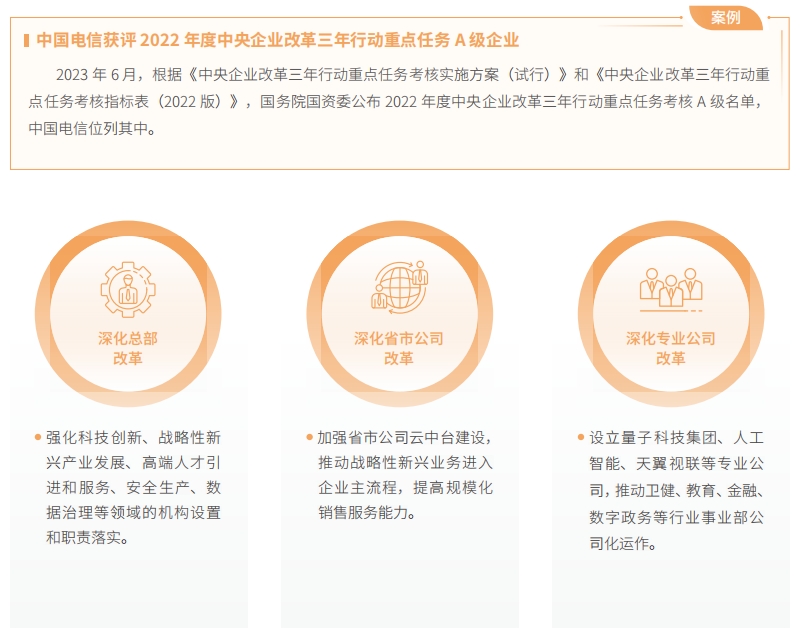 中國電信積極推動新一輪國企改革深化提升行動。完成國企改革三年行動圓滿收官。集團公司獲得中央企業(yè)重點改革任務考核 A 級,入選國資委《改革攻堅 - 國企改革三年行動案例集》。開展改革深化提升行動培訓宣貫,覆蓋總部、省公司、地市公司等重點人數超過 1000 人。“科改”、“雙百”等專項改革行動形成良好示范效應,科改示范企業(yè)擴圍至 5 家。