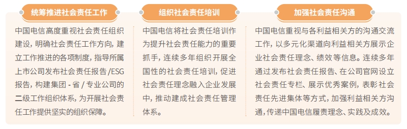 中國電信聚焦社會責任組織建設、社會責任能力提升、社會責任溝通等方面,持續(xù)提升中國電信社會責任工作管理能力。