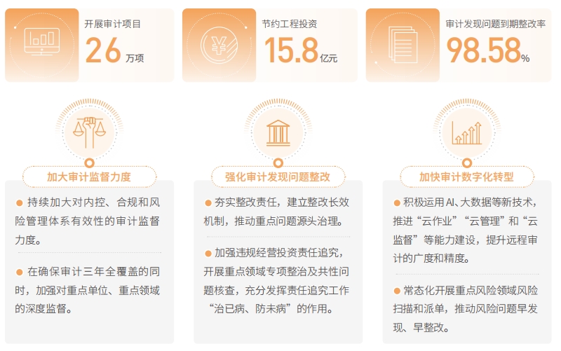 中國電信切實加強財務和審計監(jiān)督。持續(xù)完善內部控制體系,根據內外部環(huán)境變化和公司管理要求及時修訂內控手冊。健全與公司治理架構相匹配的內控體系,增強內控建設的有效性。以大數據財務風險防控系統(tǒng)為抓手,通過搭建和優(yōu)化財務風控模型、大數據交叉掃描和多維度分析,構筑財務風險防控體系。持續(xù)推進財務數字化運營,利用數字化手段提升管理能力。著力提升審計監(jiān)督效能,做好審計成果運用和責任追究,開展審計項目 26 萬項,節(jié)約工程投資15.8 億元,審計發(fā)現問題到期整改率 98.58%,服務保障企業(yè)高質量發(fā)展。