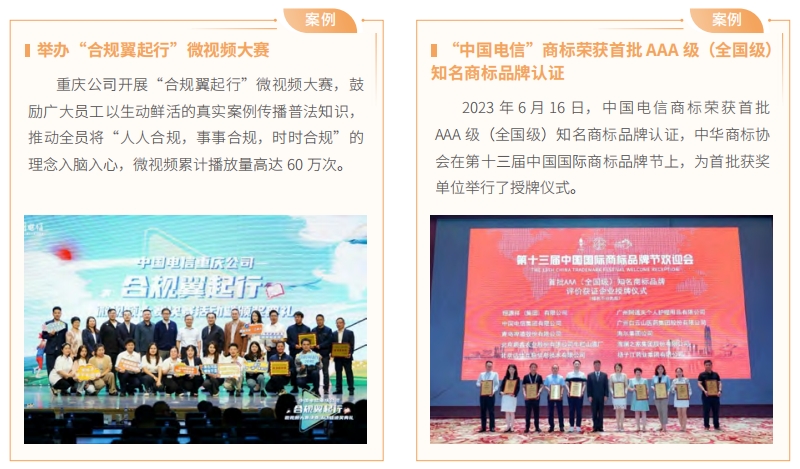 中國電信持續(xù)推進企業(yè)依法合規(guī)經營,不斷提升合規(guī)管理能力和水平。努力踐行“人人合規(guī),事事合規(guī),時時合規(guī)”理念,持續(xù)完善合規(guī)管理體系。強化組織領導,設立首席合規(guī)官,將內控管理職責納入法律部(合規(guī)管理部),助推法律、合規(guī)、內控、風險管理協(xié)同運作;加強制度建設,出臺合規(guī)管理辦法、合規(guī)手冊;完善運行機制,提升合規(guī)風險識別和預警能力,加強合規(guī)審查,促進業(yè)務合規(guī)工作清單化、要素化、流程化;加強隊伍建設,持續(xù)培育合規(guī)文化。開展合規(guī)管理有效性評價工作,及時補短板,強弱項。同時,抓好重點領域合規(guī)管理,持續(xù)加強網信安全、反壟斷、境外經營等領域合規(guī)管理,推動合規(guī)管理融入公司生產經營,保障企業(yè)高質量發(fā)展。
