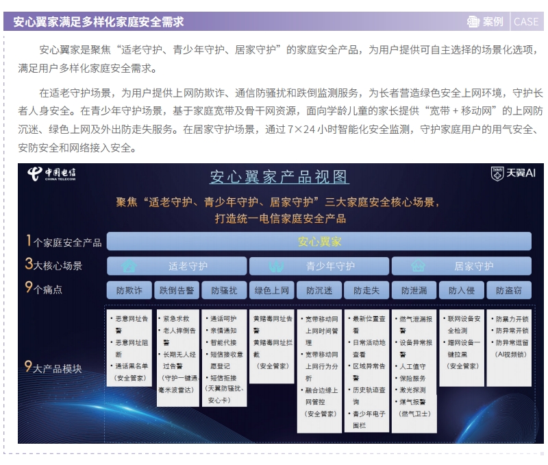 面向家庭客戶推出標(biāo)準(zhǔn)化家庭安全產(chǎn)品安心翼家,為用戶提供全方位安全守護(hù)。