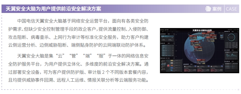 面向政企客戶建設(shè)一體化縱深安全防護(hù)產(chǎn)品和服務(wù)體系,在“AI+ 安全、終端安全、邊界安全、云安全、網(wǎng)絡(luò)安全、數(shù)據(jù)安全”等領(lǐng)域均取得能力突破。安全能力池覆蓋 31 省份 150 個重點城市,抗分布式拒絕服務(wù)攻擊(DDoS)能力超過 10Tbps,市場份額保持國內(nèi)第一,入選國務(wù)院國資委《中央企業(yè)重大科技成果摘要》及 Gartner 全球頭部服務(wù)商清單;建成全網(wǎng)一體化安全數(shù)據(jù)中心和態(tài)勢感知系統(tǒng),初步建成安全中臺能力,顯著提升安全事件的檢測、分析、處置能力;云脈 SASE 獲中國信通院首個零信任成熟度測評雙卓越級認(rèn)證,入選 Gartner2024 版《中國零信任網(wǎng)絡(luò)訪問市場指南》;建成最大的運營商級安全托管運營平臺(MSSP)。