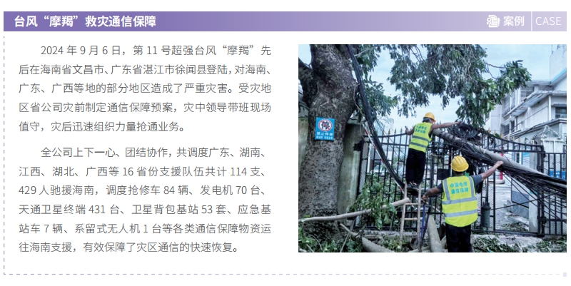 面對2024年汛期災(zāi)害點多、面廣、局地危害嚴(yán)重、超強臺風(fēng)造成極大損失等情況,公司堅持把保障人民群眾通信安全放在第一位,完成了福建、遼寧、廣東、廣西、海南、陜西、湖南、湖北、貴州等?。ㄗ灾螀^(qū))防冰凍雨雪、防汛防臺救災(zāi)以及新疆阿克蘇地區(qū)的地震通信保障。全年圓滿完成了十四屆冬運會、全國兩會、黨的二十屆三中全會、博鰲亞洲論壇、神舟系列載人航天任務(wù)、慶祝中華人民共和國成立 75 周年、第七屆進(jìn)博會、世界互聯(lián)網(wǎng)大會等重大活動通信服務(wù)保障 13 次。2024年,應(yīng)急通信累計出動人員 45 萬余人次、車輛 9 萬余車次、通信設(shè)備 6 萬余套次。