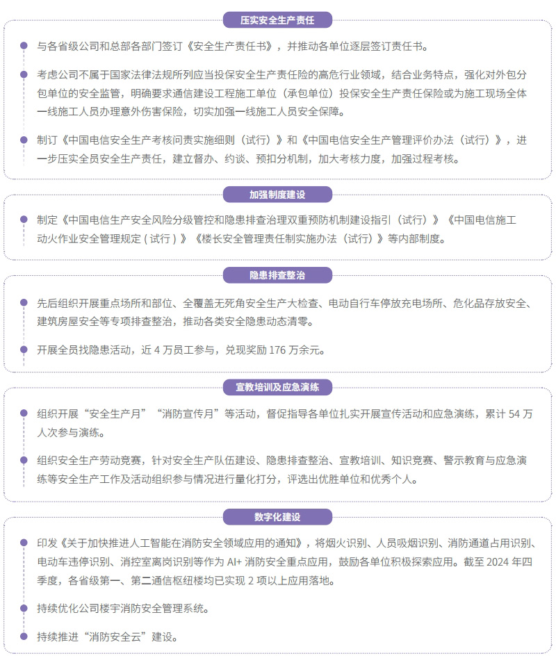 中國電信認(rèn)真貫徹執(zhí)行《中華人民共和國安全生產(chǎn)法》等法律法規(guī),切實履行安全生產(chǎn)主體責(zé)任,完善安全生產(chǎn)管理制度,修訂《安全生產(chǎn)管理辦法》,制定樓長安全管理責(zé)任制、安全風(fēng)險分級管控和隱患排查治理雙重預(yù)防機制建設(shè)指引等內(nèi)部制度,進(jìn)一步規(guī)范安全生產(chǎn)管理。深入開展安全生產(chǎn)治本攻堅三年行動(2024-2026年),加強安全風(fēng)險警示提示和隱患排查整治,深入推進(jìn)人工智能在安全生產(chǎn)領(lǐng)域的應(yīng)用,強化隱患分析通報和過程考核,持續(xù)開展安全生產(chǎn)宣傳教育培訓(xùn)和安全隱患舉報獎勵機制建設(shè),推動各類事故隱患動態(tài)清零,全年未發(fā)生一般及以上生產(chǎn)安全責(zé)任事故。