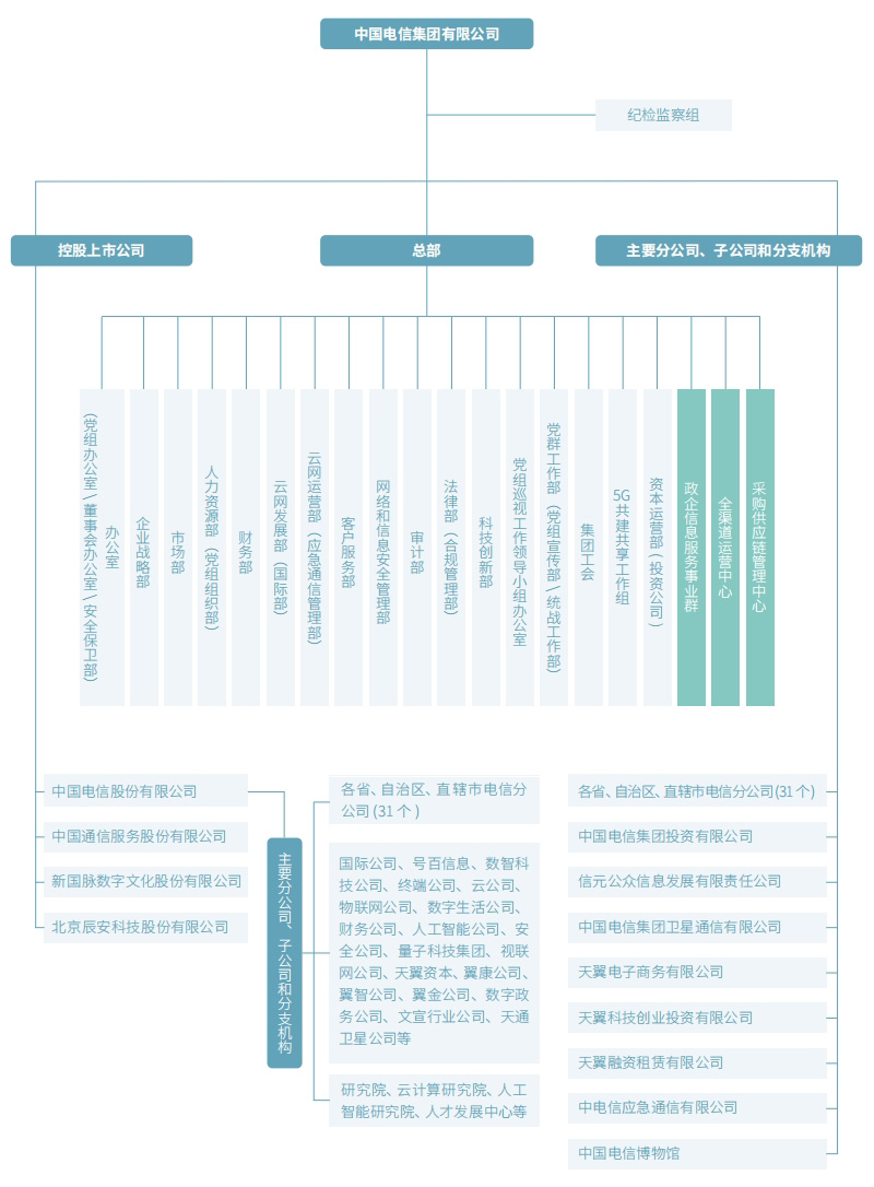 中國(guó)電信集團(tuán)有限公司是由國(guó)家出資設(shè)立的中央企業(yè)。國(guó)務(wù)院國(guó)資委代表國(guó)家履行出資人職責(zé),向集團(tuán)公司派駐監(jiān)事會(huì)。集團(tuán)公司根據(jù)國(guó)務(wù)院國(guó)資委要求設(shè)立董事會(huì)。董事會(huì)是集團(tuán)公司的最高決策機(jī)構(gòu),下設(shè)提名委員會(huì)、薪酬與考核委員會(huì)、審計(jì)與風(fēng)險(xiǎn)委員會(huì)及戰(zhàn)略與投資委員會(huì)。