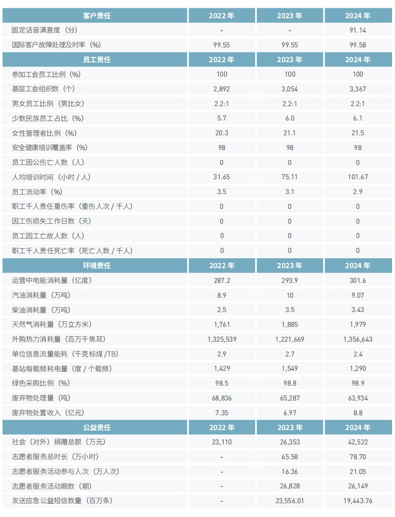 共建和諧美好社會(huì)。主動(dòng)適應(yīng)行業(yè)監(jiān)管新要求,嚴(yán)格遵守相關(guān)法律法規(guī),推動(dòng)行業(yè)健康、規(guī)范、有序發(fā)展。始終堅(jiān)持綠色發(fā)展理念,多管齊下打造綠色云網(wǎng),推動(dòng)綠色運(yùn)營(yíng)。提升服務(wù)能力,著力解決廣大客戶的急難愁盼問題。全力推進(jìn)鄉(xiāng)村振興,將企業(yè)數(shù)字化能力優(yōu)勢(shì)轉(zhuǎn)化為幫扶優(yōu)勢(shì),不斷鞏固拓展脫貧攻堅(jiān)成果,助力鄉(xiāng)村振興。持續(xù)提升客戶服務(wù),加快推進(jìn)服務(wù)型企業(yè)建設(shè)。保障員工權(quán)益,完善人才隊(duì)伍建設(shè)制度,充分調(diào)動(dòng)員工積極性,激發(fā)員工活力,弘揚(yáng)勞模精神和工匠精神,關(guān)心關(guān)愛員工生活。積極支持科教文衛(wèi)等社會(huì)事業(yè)的發(fā)展。廣泛參與“一帶一路”建設(shè),積極在海外履行社會(huì)責(zé)任,助力相關(guān)國(guó)家(地區(qū))經(jīng)濟(jì)社會(huì)發(fā)展。