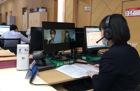 2020 年 2 月 12 日,北京市房山區(qū)政務(wù)服務(wù)中心綜合窗口工作人員使用中國電信 5G 網(wǎng)絡(luò)和全視通視頻會議,為客戶提供視頻咨詢和遠程幫辦服務(wù)