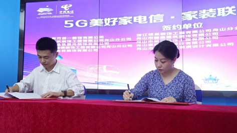 2020 年 9 月 6 日,舟山公司舉辦“5G 美好家電信·家裝聯(lián)盟成立暨卓越服務(wù)”發(fā)布會。圖為舟山公司與各家裝公司代表簽約現(xiàn)場